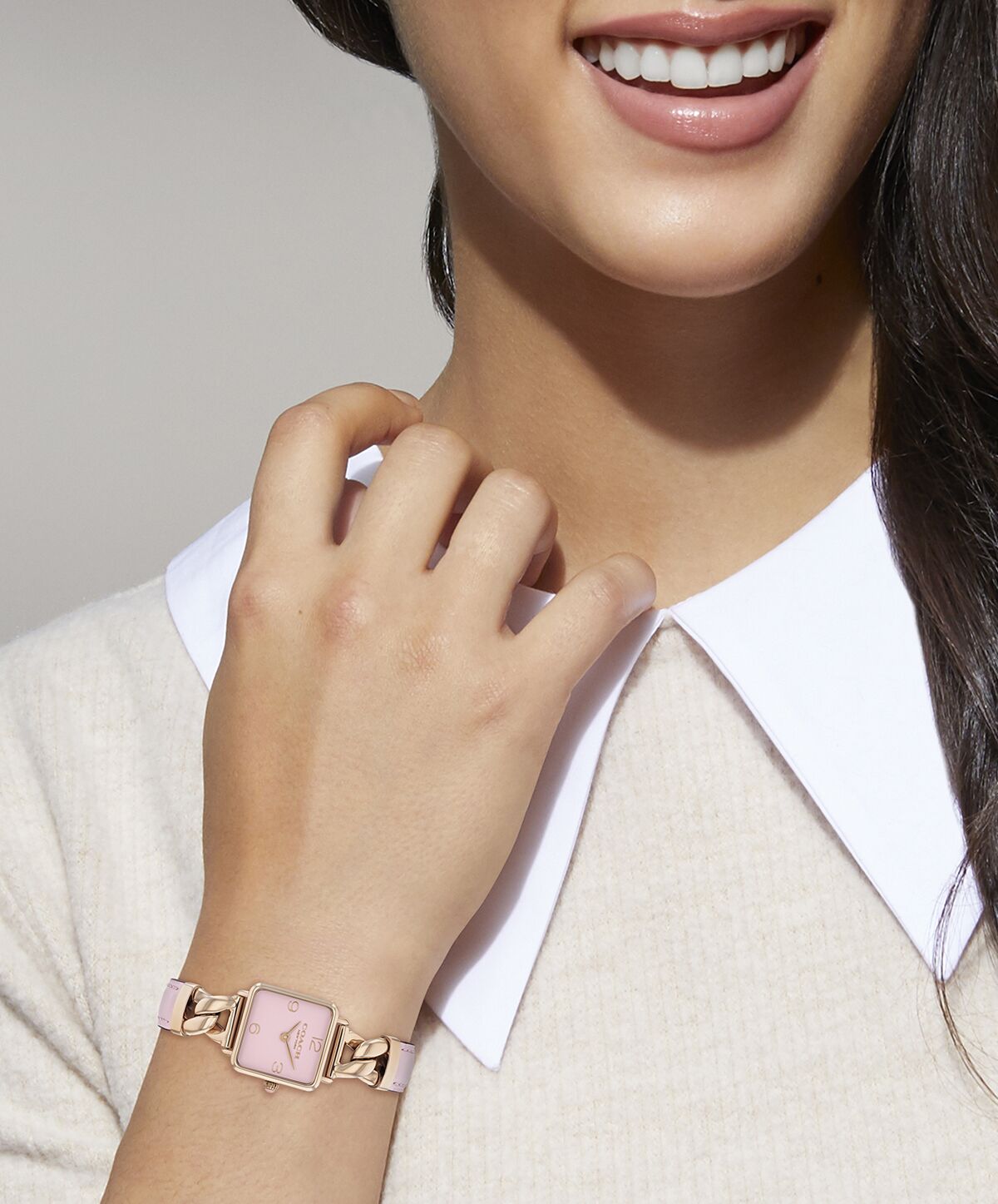 A bold square shape gives the Cass watch modern, distinctive style. Finished with a soft blush leather strap accented with a chunky chain link detail, this carnation gold tone timepiece features a blush dial and a crown cabochon