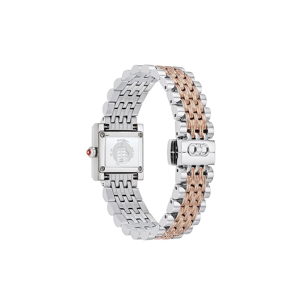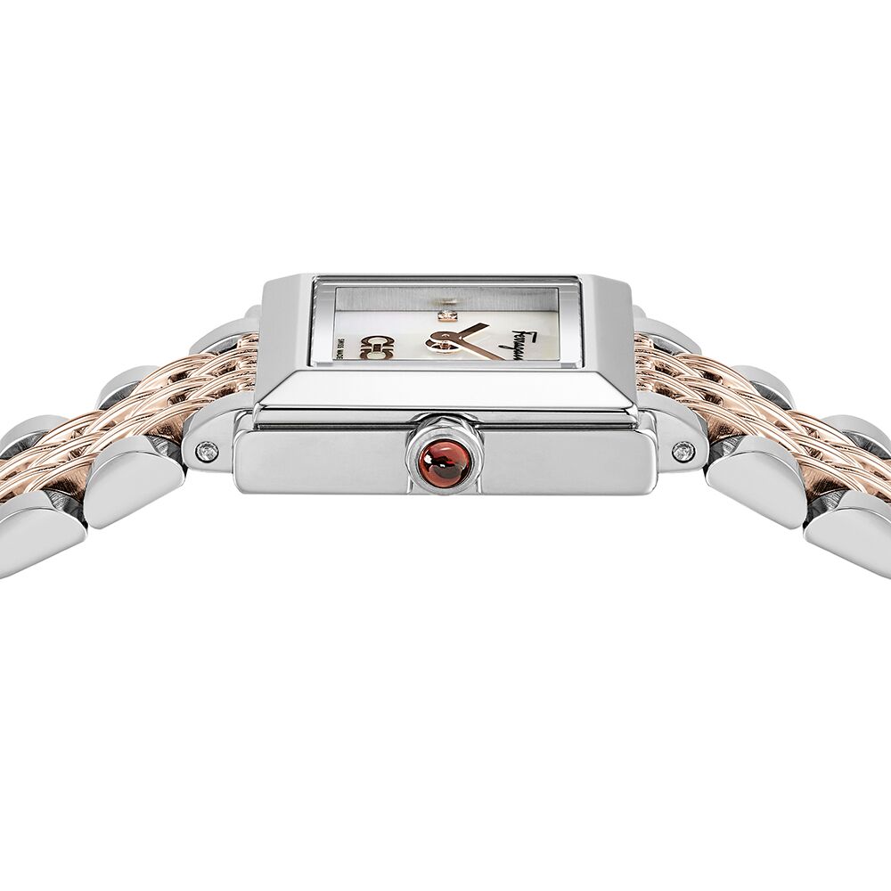 Essential. Sophisticated. Timeless. Ferragamo Square returns this season in a version that maintains the square case embellished by a rich and elegant new bracelet The case encloses a delightful mother of pearl dial with studs or two diamond idexes and the ever present double Gancini symbol at 6 o’clock It is a contemporary and timeless collection