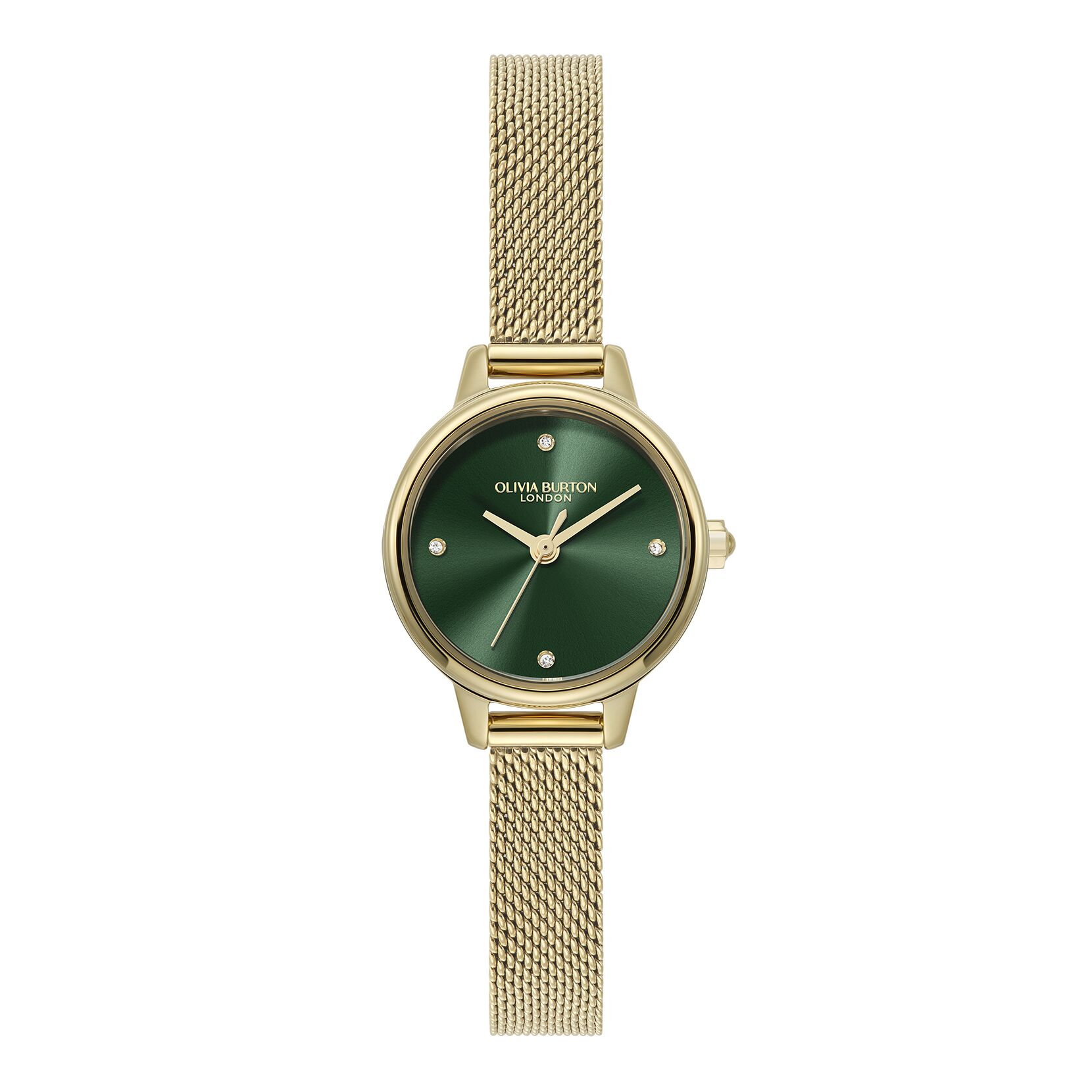 The mini watch is back and more beautiful than ever. Designed to blend modern with classic, this dainty 23mm dial is as pretty as a piece of jewellery. Its glowing sunray dial in rich Forest Green is embellished with tiny crystal markers for a touch of sparkle. Finished with a beautiful gold-plated mesh strap, this petite style is perfect for stacking.