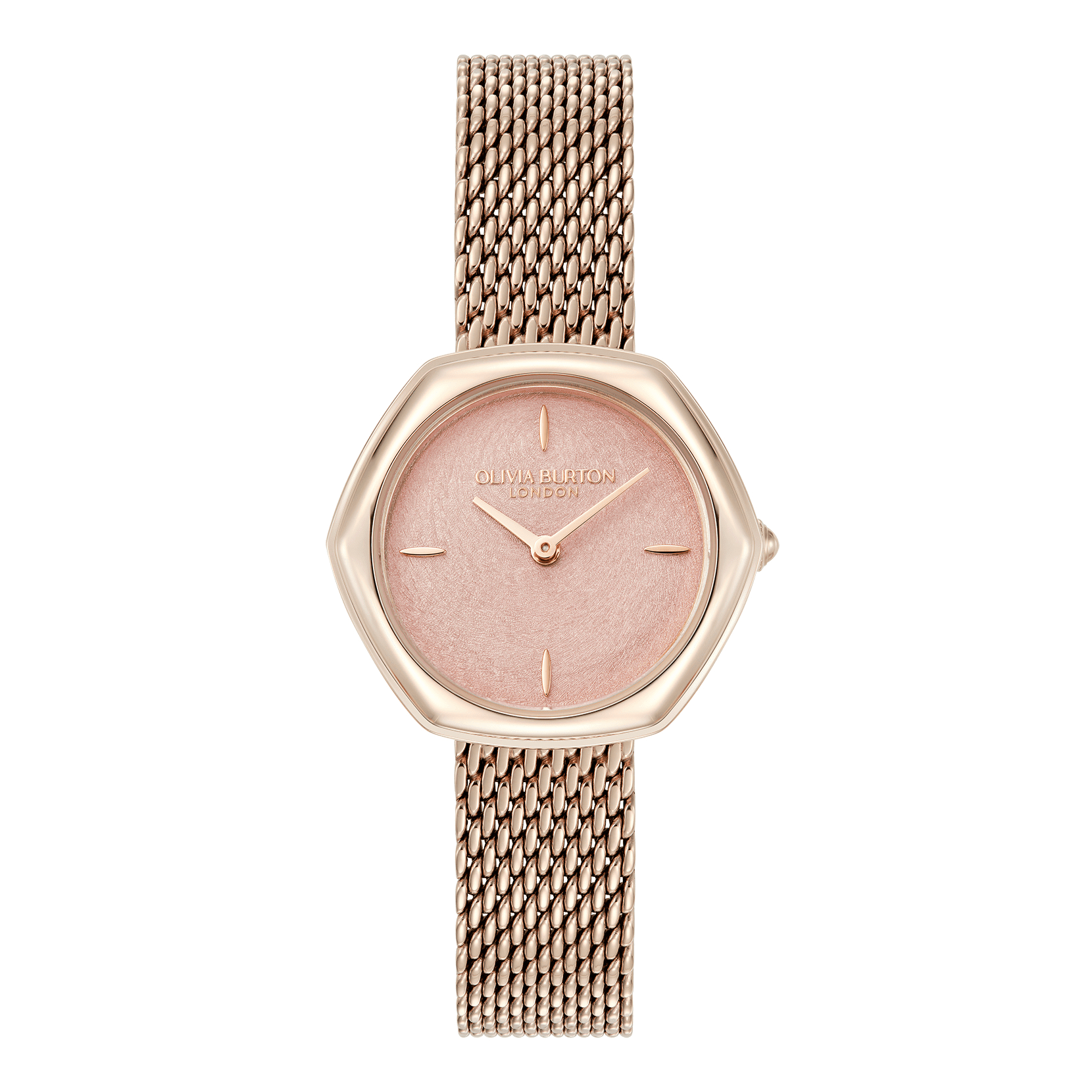 The hexagon shape is one we at Olivia Burton love. We’ve never used it as a watch case – so this is an exciting first! We added a powder texture inspired by luxurious eyeshadows for some subtle shimmer.