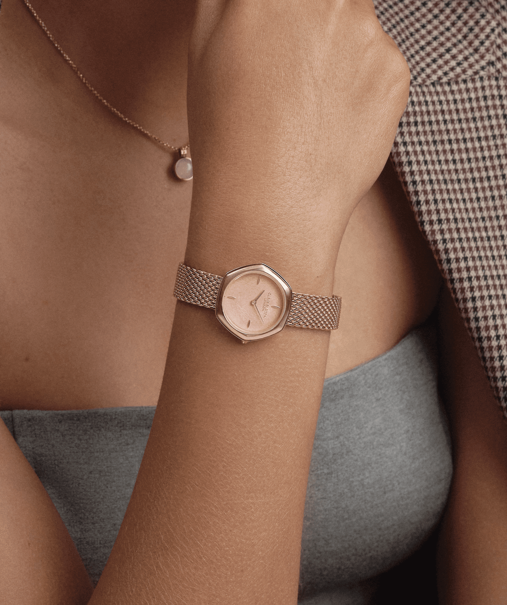 The shimmer dial has a distinctive powder finish in a choice of Mellow Rose, Silver or Raven Black. Paired with a mesh strap with tessellating links echoing the geometric theme, there’s a choice of gold, silver and rose gold finishes.