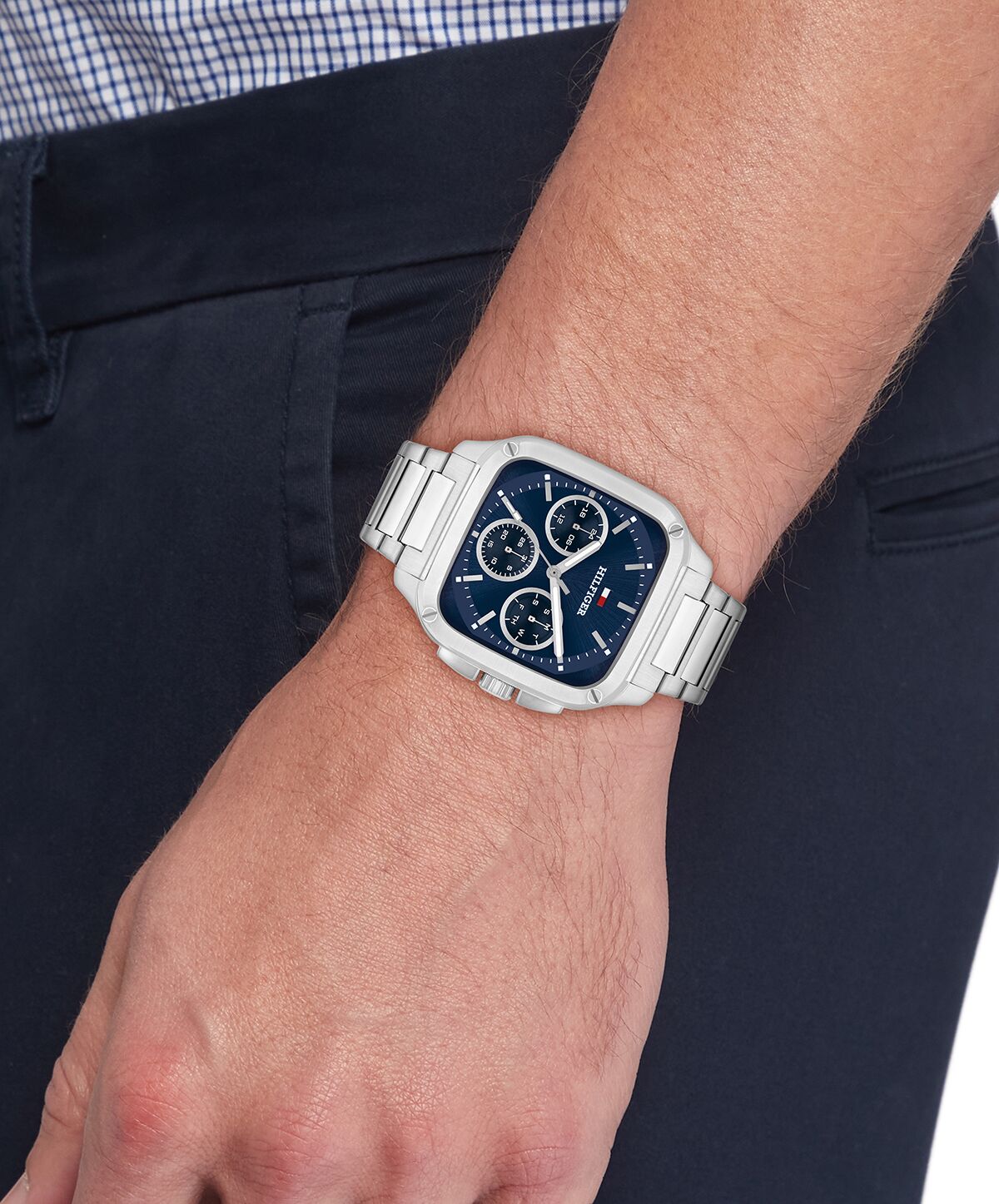The Tommy Hilfiger men’s watch surprises with its intricate design. The 37mm x 39mm case features a sunray brushed dial, circular brushed outer ring, and fine CD texture sub-eyes, while shaped pushers and signature screw details on the bezel add a unique touch. Available with integrated bracelets or genuine leather straps, it combines Japanese multifunction movement with elegant finishes in stainless steel, gold plated, rose gold, black, or blue.