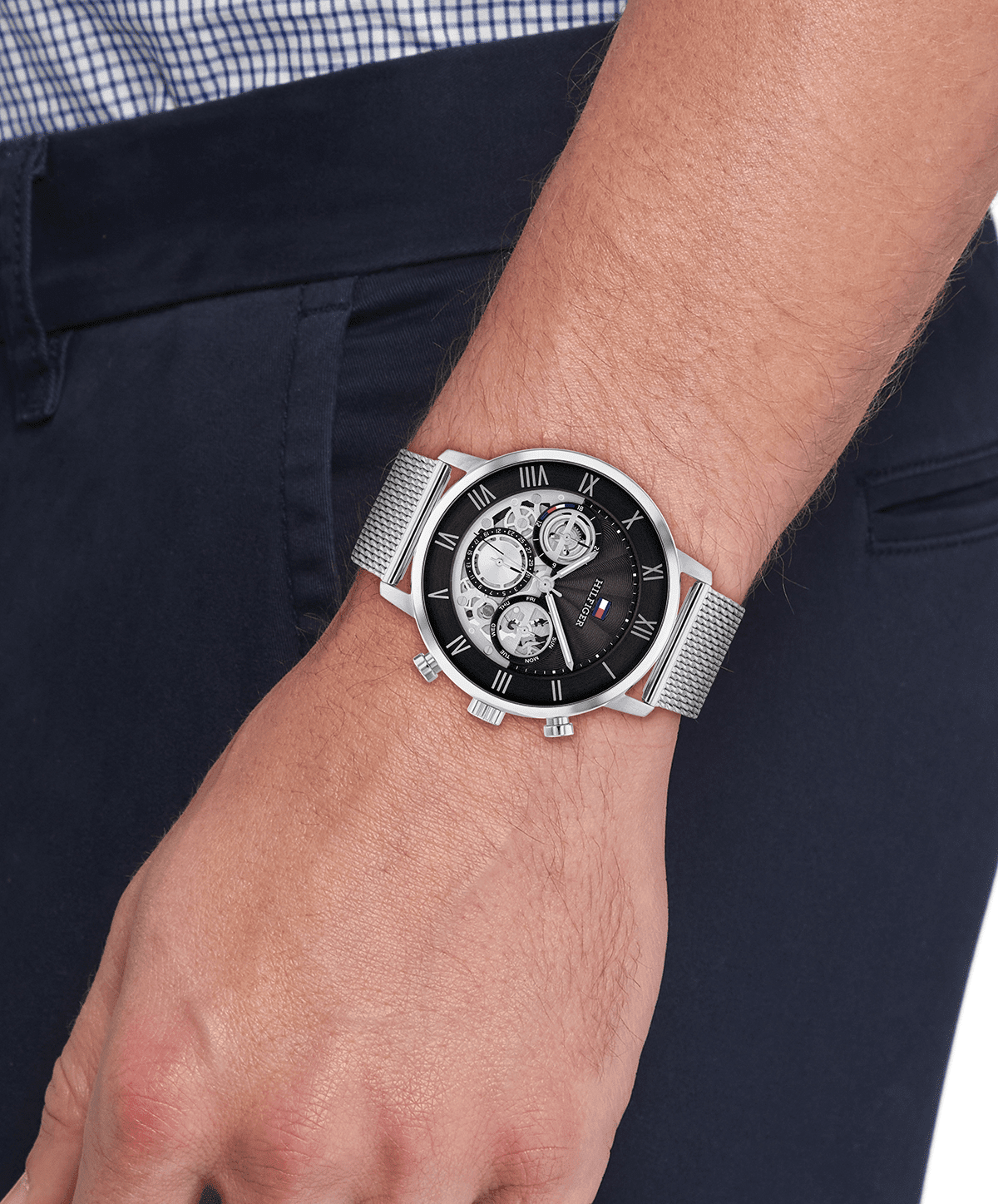 Made for the modern man who appreciates detail. Roman numerals surround the multi-layered open-heart movement, while the new Hilfiger branding keeps it classic. This Tommy dress watch will have you looking closer so that you don’t miss a second. Mesh bracelets or link bracelets. Multi-function, 44MM