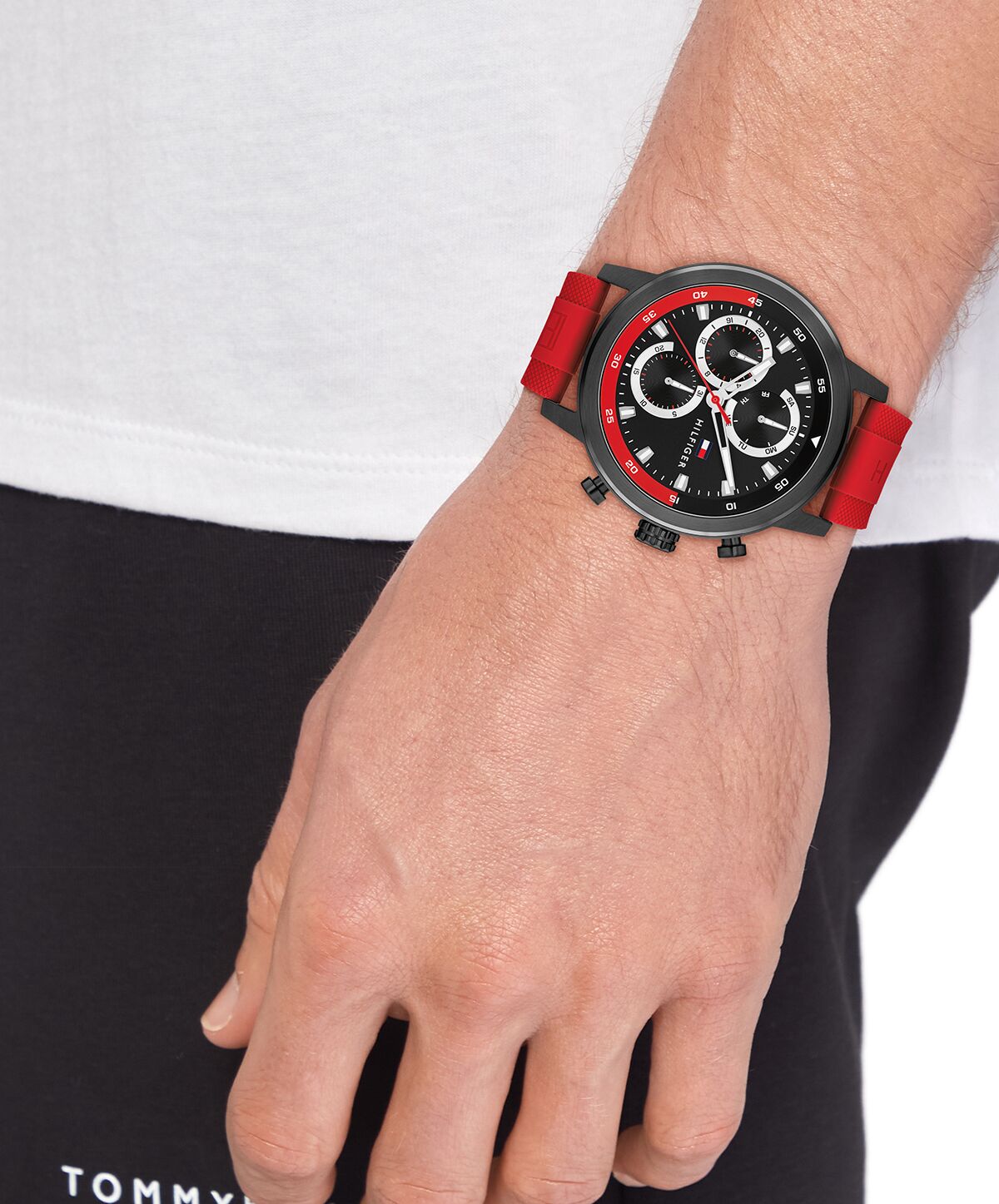 Bold and sporty, the new Tommy Hilfiger men’s watch adds a pop of color to your wrist. Featuring silicon straps, a sporty oversized crown and pushers, and a sunray dial with applied stick indexes and CD-textured sub-eyes, it’s the perfect blend of style and performance.